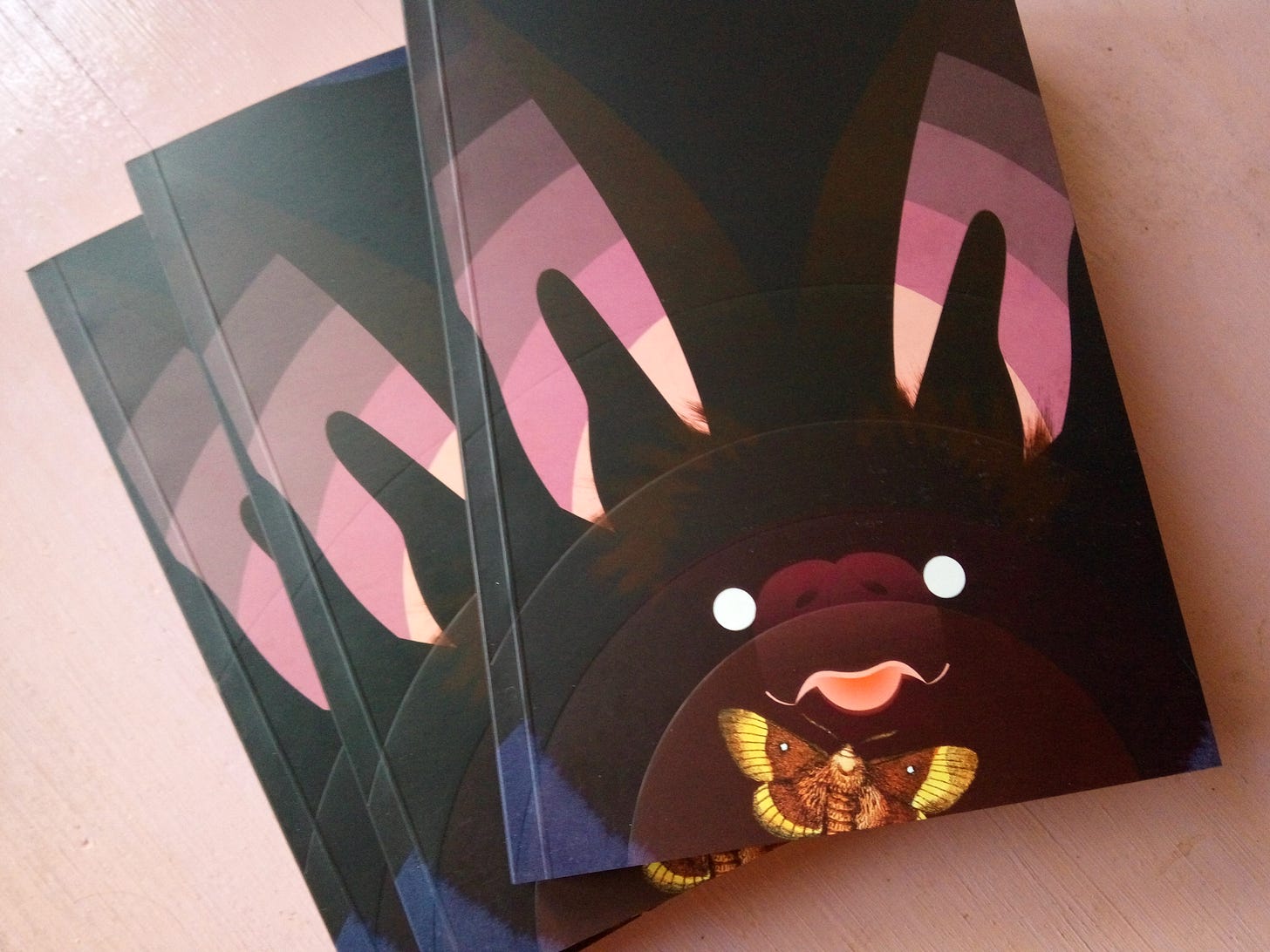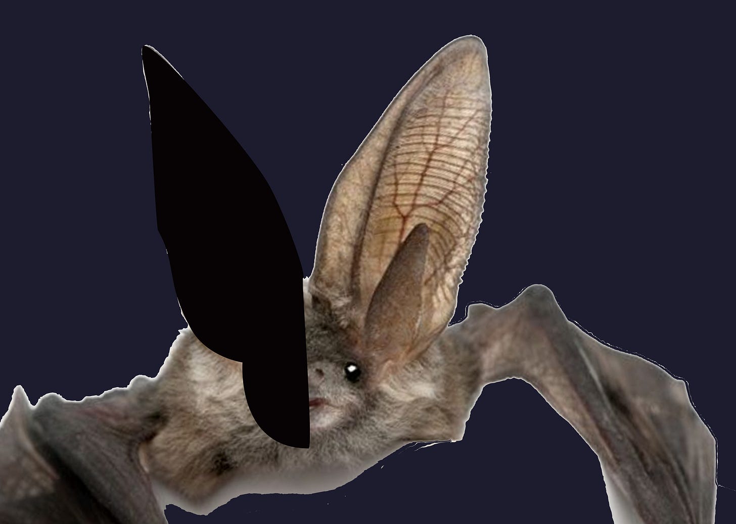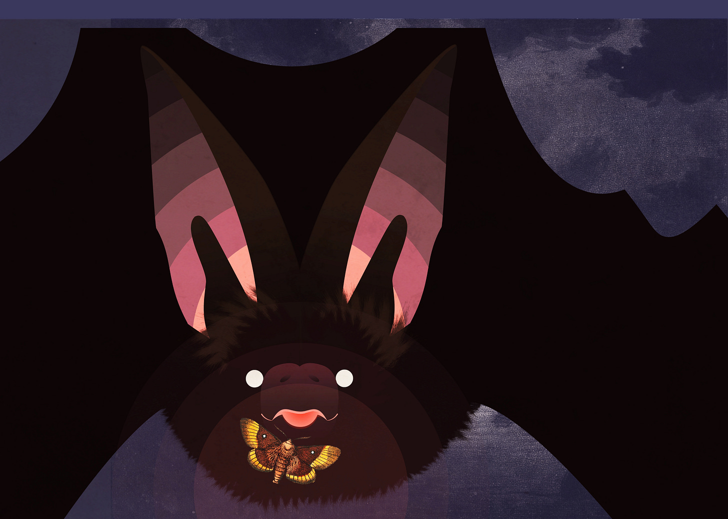 I decided to turn the brightness up, put some fur in the ears, add a snout, give the backdrop some texture and give the bat a moth to snag. All of these could be mistakes — I’m still not 100% sure of any of them! But the collage element that was key to the Headbooks’ visual identity was missing, so the moth — or something like it — was needed.