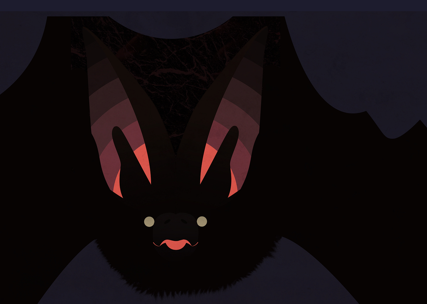 So onto the most inspired part: the ears, as well as containing all the pinks and purples, could suggest the soundwaves, at the same time as the lateral creases in the bat’s pinnae. The tragi (those front-parts) slightly get in the way, but help make it more recognisable as a bat.