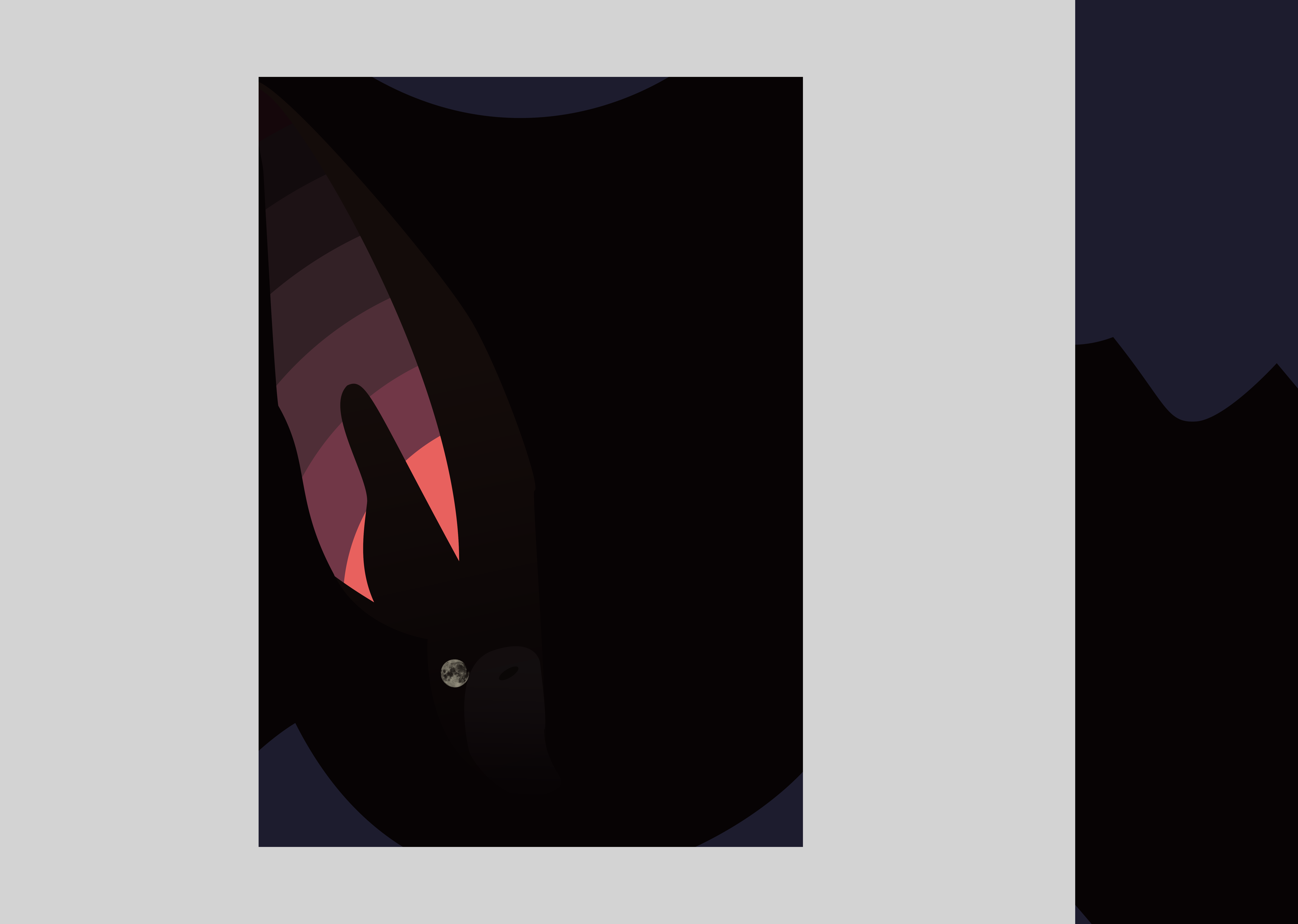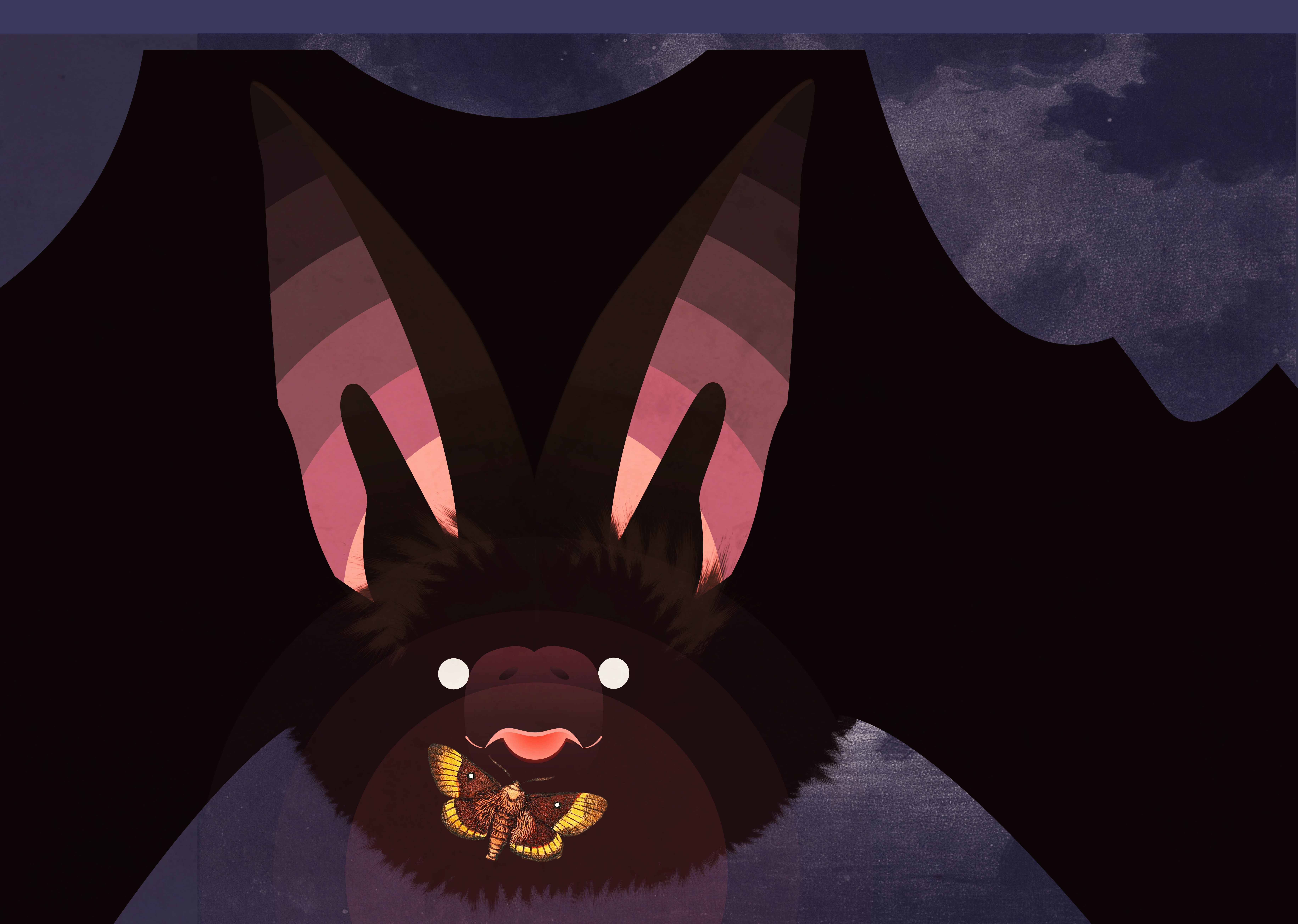 The colour palette was decided at these early stages, and I experimented with two concepts: bat with soundwaves emanating from mouth (above), and bat in close-up silhoutette with moon for eye (below).